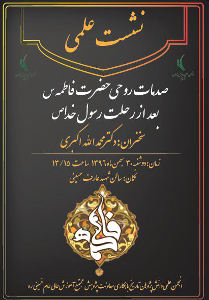 نشست «صدمات روحی حضرت فاطمه (س) بعد از رحلت رسول خدا (ص)» با ارائه دکتر محمد الله اکبری 30 بهمن 96 ساعت 13/15 در مجتمع آموزش عالی امام خمینی (ره)، سالن شهید عارف حسینی برگزار می گردد.